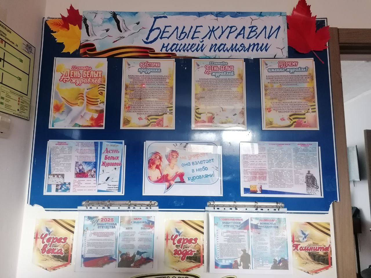 В преддверии Дня Белых Журавлей,который мы отмечаем 22 октября,библиотека с. Гродеково преобразилась, наполнившись символами мира и памяти. Информационно-иллюстрационные уголки и тематические выставки распахнули свои двери, чтобы рассказать о трагических событиях прошлого и почтить память тех, кто отдал свои жизни за мирное небо над головой. Отдельное место в экспозиции занимает творчество дагестанского поэта Расула Гамзатова, чьи бессмертные строки «Журавлей» стали гимном памяти и скорби.