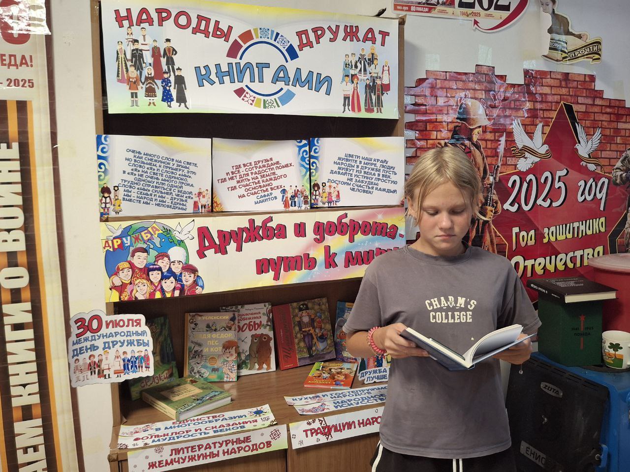 Начался праздник с познавательной беседы, где ребята узнали об истории этого замечательного дня,его традициях и значении дружбы в нашей жизни.Каждый получил яркий раздаточный материал,который помог лучше усвоить информацию.  Далее ребят ждало знакомство с книжной выставкой «Народы дружат книгами».Они с удовольствием читали отрывки из любимых произведений о дружбе,таких как «Тимур и его команда» и «Маленький принц».